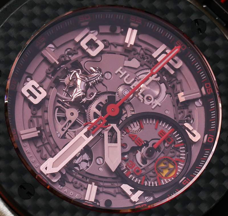 所有 Hublot Big Bang Ferrari 手表內部均裝有自制的 UNICO ref. 1241 自動導柱輪計時機芯。它具有 72 小時的動力儲存、日期、時間和 60 分鐘計時碼表。該機芯仍然感覺非常現代,外觀既工業又高端。自動陀的設計看起來像一個車輪。