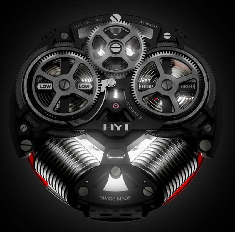 H2 的運動看起來像活塞發(fā)動機,是與 Renaud & Papi 合作生產的,盡管它們不涉及液體系統(tǒng)。它具有 192 小時的動力儲存,配備逆跳分鐘針,而小時則通過管中的藍色液體指示。基本上,您會查看小時刻度上液體線的終點。這是一個非常聰明且具有未來感的系統(tǒng),我們真的很欣賞。除了原來的綠色液體,HYT 開始展示一系列顏色,例如紅色和藍色——這些顏色都將在今年小批量展示。