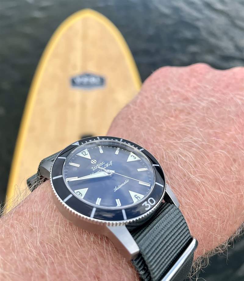 ZO9209 基于越南戰(zhàn)爭期間在美國和東南亞的軍事郵政交易所 (PX) 銷售的型號。美國服役人員開始相信 Zodiac 時計(jì)的制造質(zhì)量和可靠性,在中部高地和湄公河三角洲這樣多樣化和令人生畏的地區(qū),這說明了一些事情。由于其功能強(qiáng)大且堅(jiān)固耐用的設(shè)計(jì),該設(shè)計(jì)在越南流行起來。Zodiac 在越南戰(zhàn)爭期間的能力和可靠性為其贏得了堅(jiān)定的聲譽(yù)。它的傳統(tǒng),加上現(xiàn)代設(shè)計(jì)和制造工藝,使它成為 T 的輕松選擇,而這個決定很快就影響了我們其余的手表收藏之旅。快進(jìn)幾個月,T 已經(jīng)完成了 ZO9209(這東西需要一個昵稱;稍后會詳細(xì)介紹)。T從美國機(jī)房拿走了ZO9209 海軍艦艇前往沙橋沖浪,超級海狼號迎接所有挑戰(zhàn)。它已成為他的首選時計(jì)。