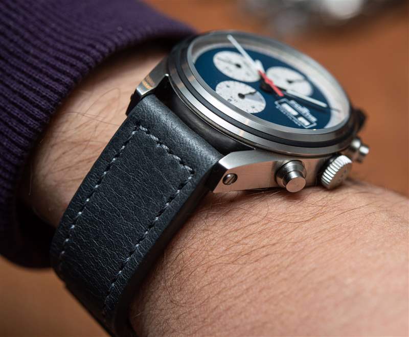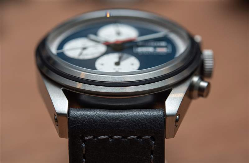 41 毫米寬的表殼采用再生不銹鋼制成,在金屬中觀看時最能欣賞到美感。塊狀表耳以強烈的曲線打造出平流層的輪廓,配有兩個倒置的按鈕和被橡膠條分成兩半的表圈。就像表盤一樣,表殼乍一看也很簡單——可以說太簡單了,但這種設計會通過長時間的佩戴展現出經過深思熟慮的新細節。表殼和表鏈感覺可以使用很長時間——不僅僅是因為它們的塊狀設計,還因為它們的貼合度和表面處理。一個典型的例子是帶有三個墊圈的旋入式表冠,按鈕的精確配合保證了 200m(660ft)的防水性能,這適合在真正的手表愛好者的監督下制造的手表。