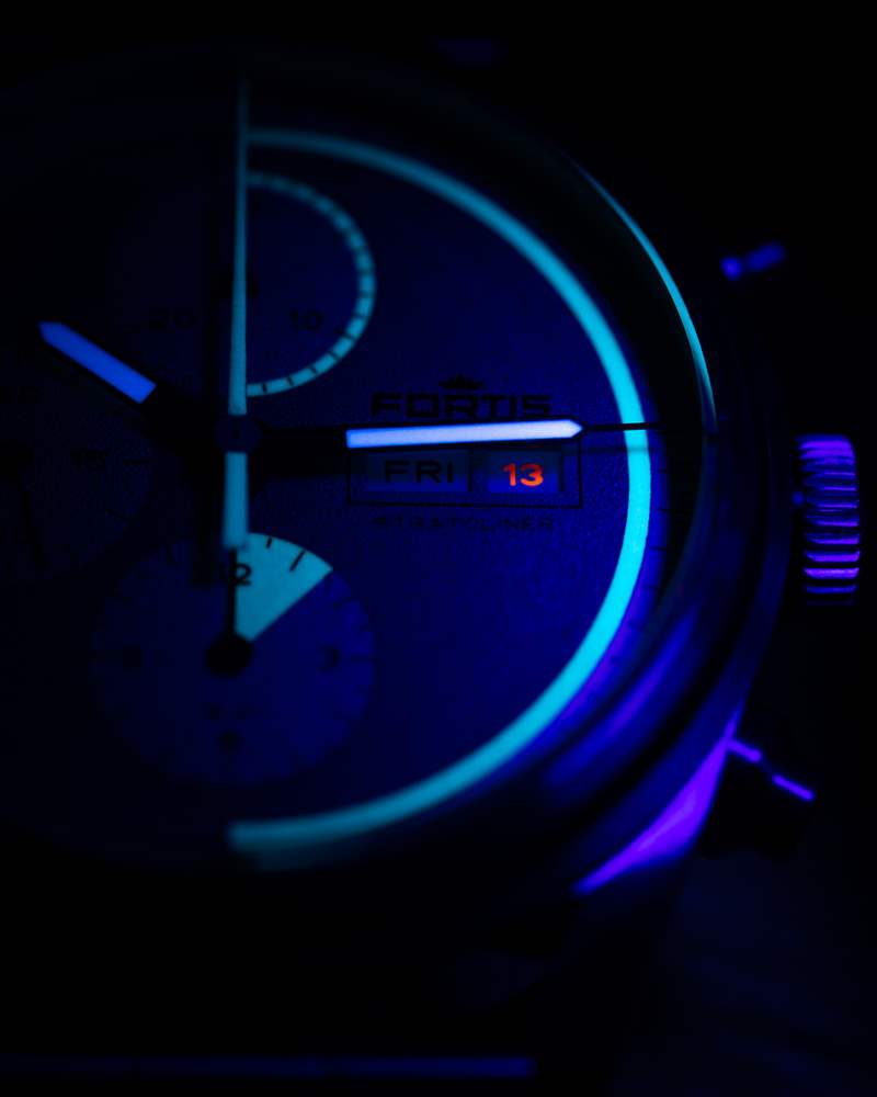 Stratoliner 有多種表盤組合可供選擇,就連貫性和獨特性的理想融合而言,極地白色和藍色表盤可能是其中最好的。Fortis 為其表盤的纖薄而感到自豪,而且小表盤是平坦的,而不是凹陷的;日期和星期顯示都比平常更清晰,更靠近水晶。指針大而易讀,具有強烈的夜光和黑色輪廓,注射器式分針以精致的刻度準確地指示分鐘。雖然繁忙的秒針刻度非常適合準確讀取計時秒針,但它使分鐘的讀取變得復雜。由于每隔五個位置沒有一個大的時標,因此以分鐘的精度報時需要一些時間來適應。