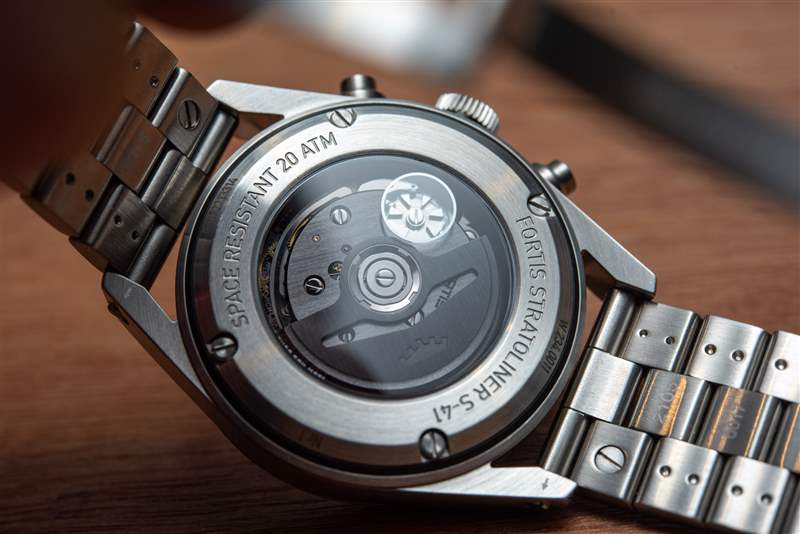 Fortis Stratoliner 由 Fortis Werk 17 提供動力 – 請注意,它不是 法語中的 “機芯” ,而是德語中的“werk ”,暗示了該品牌的 Grenchen 基地。如果您是 Fortis 的鐵桿粉絲,您會稱其為 Werk siebzehn(德語中的“17”)。Werk 17 是一款經過“平流層測試”的自制機芯,與高端機芯制造商 La Joux-Perret 合作制造,而非計時碼表 Fortis Werk 13 則由勞力士-都鐸-香奈兒旗下的 Kenissi Manufacture 制造。Werk 17 結合了 60 小時的動力儲存、軸承式自動上鏈系統和導柱輪操作的計時碼表。