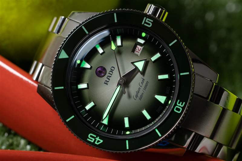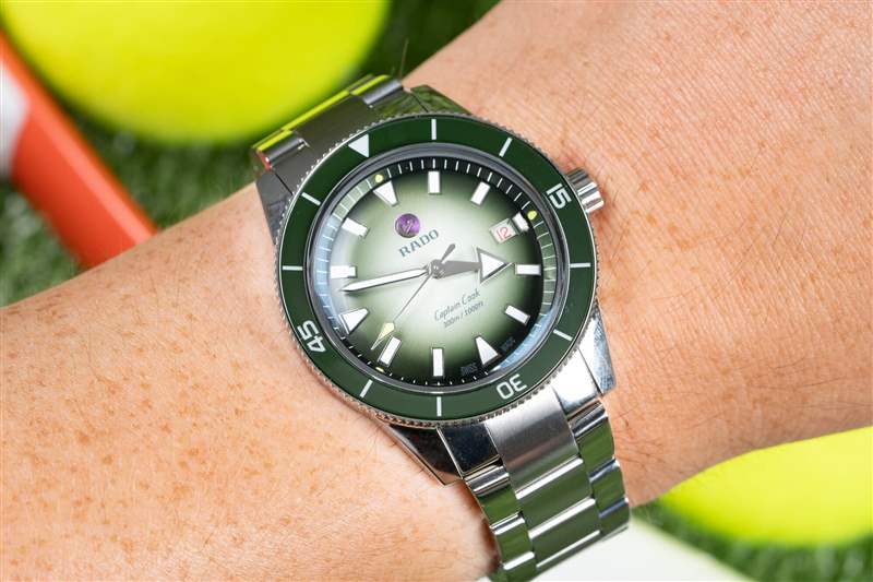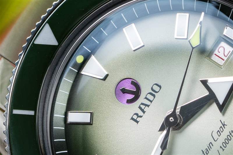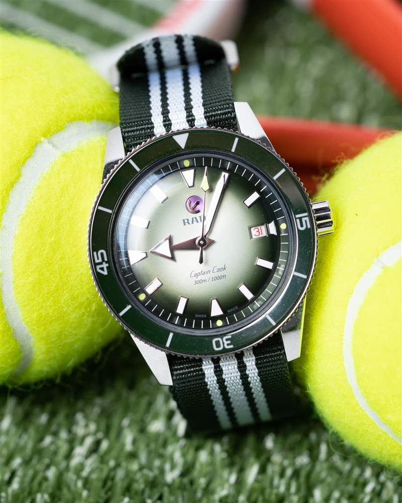 卡梅倫·諾里 (Cameron Norrie) 庫(kù)克船長(zhǎng) (Captain Cook) 的表盤是這一切的集大成者。這就是 Norrie 和 Rado 享受樂(lè)趣的地方。您擁有標(biāo)準(zhǔn)的大箭頭時(shí)針(加上網(wǎng)球黃色秒針尖端)和所有庫(kù)克船長(zhǎng)腕表上都有的應(yīng)用標(biāo)記,以及相同的表盤文字和精美的紅色文字日期輪。這一切都很棒,您不會(huì)聽(tīng)到我對(duì) Super-LumiNova 的易讀性和亮度提出任何抱怨。Norrie 版本將北約 (NATO) 的白色和綠色圖案與表圈融為一體,引入了從白到綠的漸變,最終形成深綠色的章環(huán)。