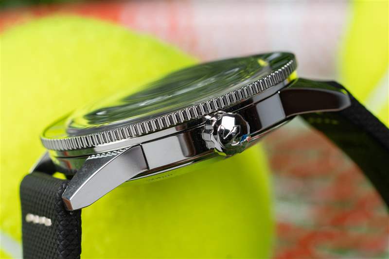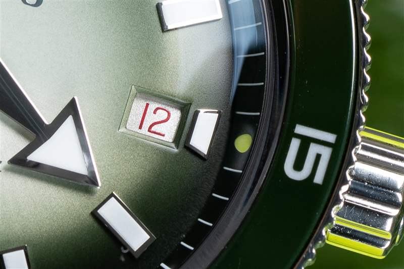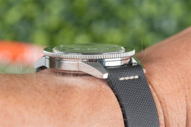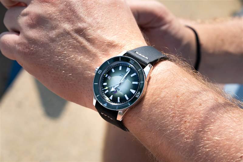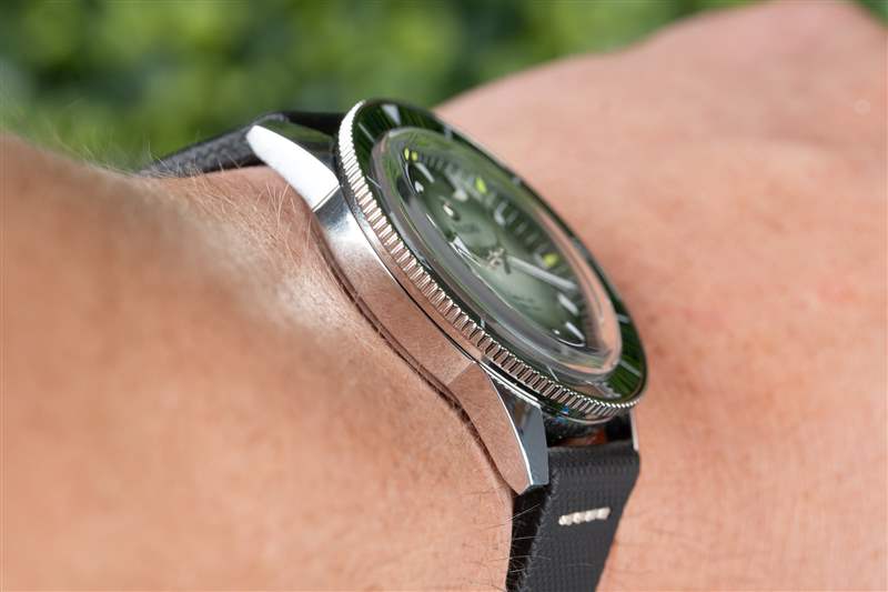 庫(kù)克船長(zhǎng)系列的標(biāo)志是其體育場(chǎng)表圈。硬幣邊緣經(jīng)過(guò)完全拋光,綠色陶瓷嵌件也是如此,其上刻有 Super-LumiNova 填充標(biāo)記。與扁平邊框類似,但外觀更酷,這種風(fēng)格最大化了握持面積,同時(shí)最小化了高度,而更常見(jiàn)的凸形邊框通常會(huì)導(dǎo)致更高的高度或更少的握持力??梢钥隙ǖ氖?,卡梅倫諾里庫(kù)克船長(zhǎng)通過(guò)了我嚴(yán)格的表圈測(cè)試:當(dāng)我的手和表圈都是濕的時(shí)(在我兒子洗澡時(shí)和在海里時(shí)),我能夠旋轉(zhuǎn)它。高度的比例優(yōu)勢(shì)也很明顯,腕表厚度為 12.3 毫米,佩戴起來(lái)非常舒適,尤其是對(duì)于 42 毫米、300 m WR 腕表而言。雖然它不是瑞士 300m 跳水運(yùn)動(dòng)員中最瘦的,但它擊敗了歐米茄海馬和勞力士潛航者,前者的表圈在潮濕時(shí)毫無(wú)用處。