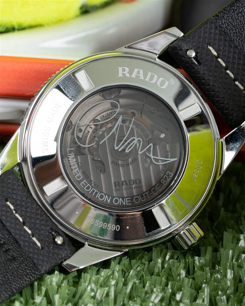 作為限量版,該腕表配備煙熏藍(lán)寶石水晶表底蓋,底蓋上印有 Cameron Norrie 的簽名和金屬印花的限量版文字——該腕表限量發(fā)行 823 枚,以紀(jì)念 Norrie 的 8 月 23 日生日。印刷是這樣的,只有在光線照射下你才能看到清晰的視野,我更喜歡不那么神秘的“永遠(yuǎn)在線”的替代方案。透過(guò)表背,您可以看到基于 ETA C07.611 的 Rado R8763 自動(dòng)機(jī)芯。這款機(jī)芯在斯沃琪集團(tuán)旗下的其他地方也有使用,例如 Midos 的 Calibre 80 和 Hamiltons 的 H-10。實(shí)際上,它是一款已降頻至 21,600 vph 的 ETA 2824-2,可提供 80 小時(shí)的動(dòng)力儲(chǔ)存。在我坐下來(lái)寫這篇文章的那天,我在離開(kāi)幾天后拿起手表戴上,并驚喜地發(fā)現(xiàn)它仍然準(zhǔn)時(shí)運(yùn)行。
