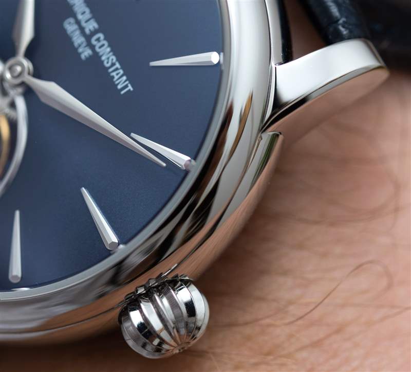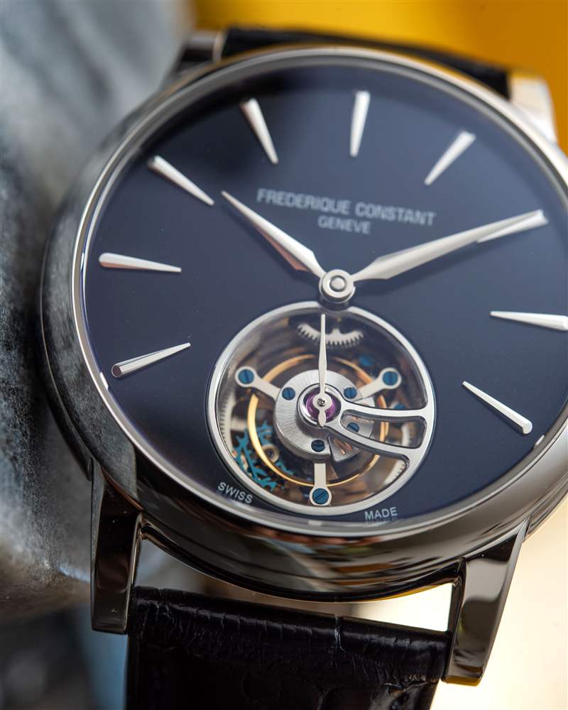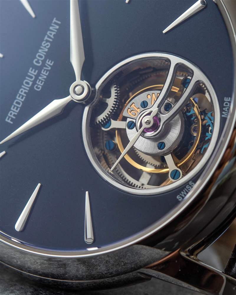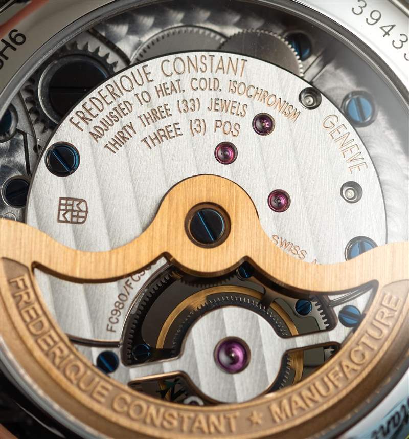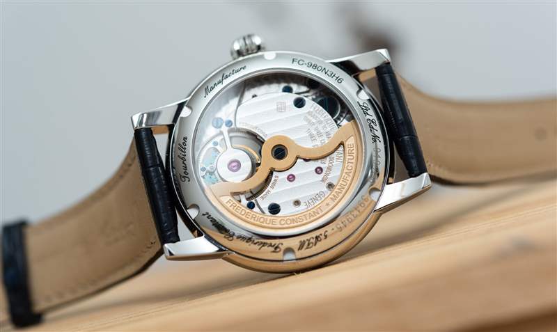 巨大的指針以其體積、復雜的形狀和明顯的縱向彎曲給人留下了深刻的印象。它們也是 FC-980 自產機芯的力量展示,該機芯不僅承載著巨大的時針和分針,還承載著陀飛輪組件。動力儲存只有區區38小時,很短,但至少是自動補充的。FC-980機芯調校為熱、冷、等時、三方位,但沒有說明是否是經過認證的天文臺表。