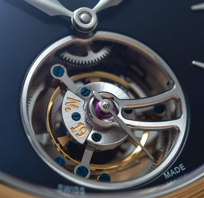 它擁有瘋狂移動的擺輪——拋光的金色色調,帶有陡峭的倒角,觸感非常好——其快速擺動幾乎無法辨認,而三臂框架則跟隨每一次滴答聲并以彈性的方式滑動。優雅時尚,60 秒畫一圈。這些同軸運動確實很巧妙,有一個小擒縱輪在周圍運轉,就好像它著了魔一樣。從上方固定陀飛輪組件的框架和鏤空夾板(如果它的兩端固定在機芯上,則可以稱為夾板)經過精心打磨,邊緣經過斜角和拋光處理,甚至在最深處還為大顆寶石設計了拋光埋頭孔。中心。它是秩序、平衡和機械美的縮影。